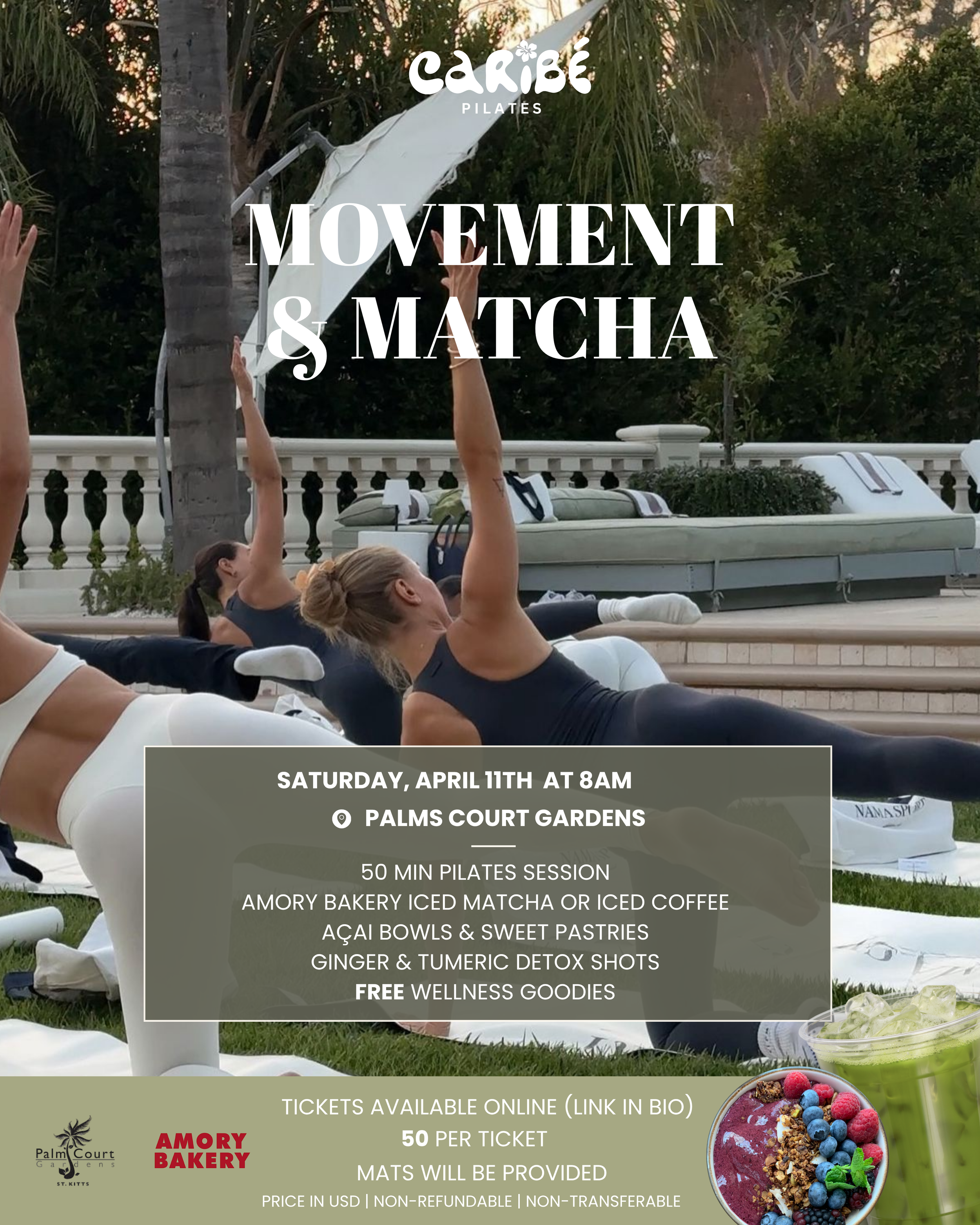 Join us at our monthly Movement & Matcha, in collaboration with Amory Bakery at Palms Court Gardens, St. Kitts!